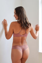 Der Spitzen-String Tilda besteht vorne aus seidigem Stoff aus Tencel Lyocell und hinten aus zAfter, in Deutschland produzierter Spitze in coffee rose. Durch die glatten Materialien zeichnet sich garantiert nichts unter engen Hosen ab. Der nachhaltige Spitzen-String ist wie ein liebevolles Geheimnis: feminin designt, so weich wie deine Haut und fast unsichtbar unter deiner Kleidung - dabei super bequem. Die Farbe ist eine wunderschöne Mischung aus dunklem Altrosa und einem Hauch von Kaffee.